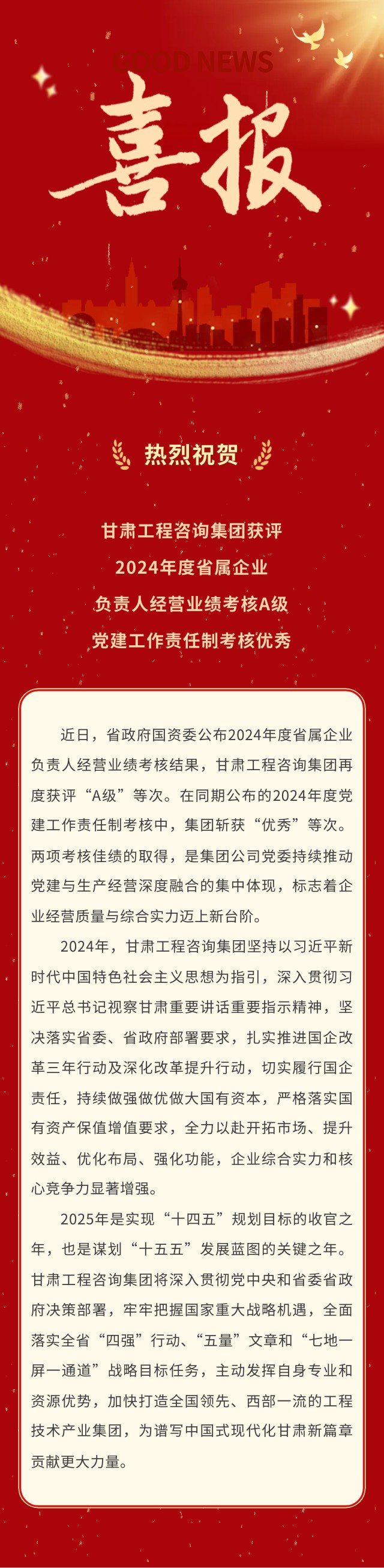 喜報 | 甘肅工程咨詢集團榮獲2024年度省屬企業(yè)考核“雙優(yōu)”佳績:經營業(yè)績考核A級、黨建工作責任制考核優(yōu)秀