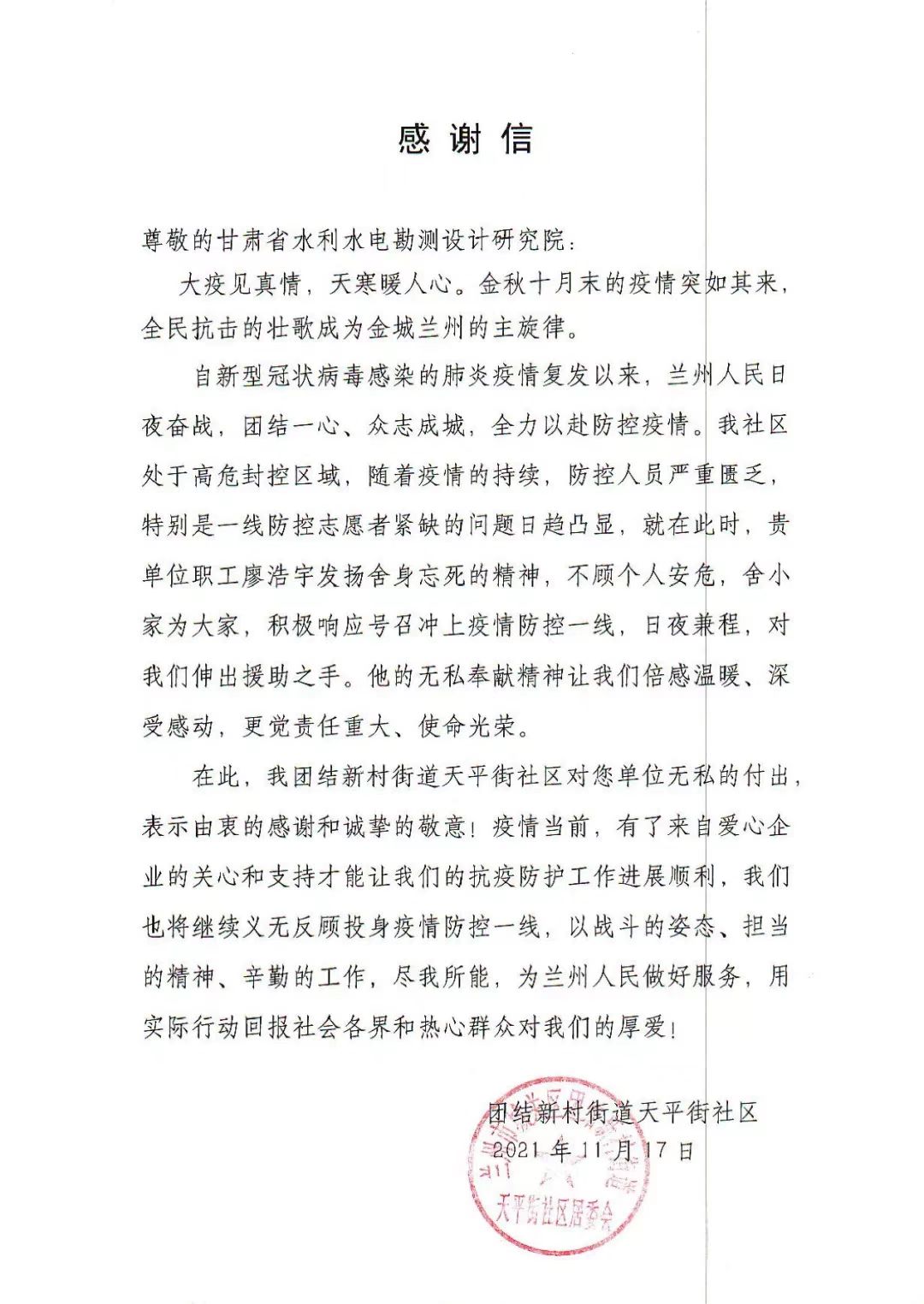 近日,水電設(shè)計(jì)院收到中志協(xié)蘭州服務(wù)隊(duì)和團(tuán)結(jié)新村街道天平街社區(qū)發(fā)來的感謝信。信中對(duì)水電設(shè)計(jì)院規(guī)劃院?jiǎn)T工廖浩宇在此次疫情發(fā)生后,主動(dòng)請(qǐng)纓參加疫情防控服務(wù)工作,甘當(dāng)疫情防控最美逆行者,持續(xù)堅(jiān)持26天志愿者服務(wù)的先進(jìn)事跡表示感謝。