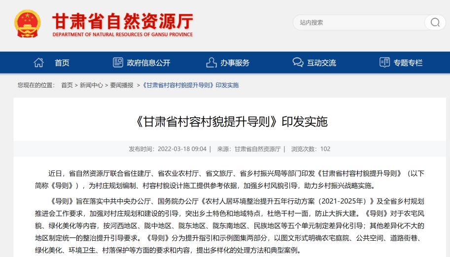 為進一步貫徹落實中共中央辦公廳、國務院辦公廳《農村人居環(huán)境整治提升五年行動方案(2021—2025年)》及全省鄉(xiāng)村規(guī)劃推進會精神,由甘肅省城鄉(xiāng)規(guī)劃設計研究院有限公司牽頭,聯(lián)合甘肅省建筑設計研究院有限公司、西北師范大學城市規(guī)劃與旅游景觀設計研究院編制的《甘肅省村容村貌提升導則(試行)》(以下簡稱《導則》),于3月18日由省自然資源廳、省住建廳、省農業(yè)農村廳、省文旅廳、省鄉(xiāng)村振興局等五部門聯(lián)合印發(fā)?!秾t》的發(fā)布為全省村莊規(guī)劃編制工作提供了參考依據(jù),是推進鄉(xiāng)村振興戰(zhàn)略實施的重要抓手,是改善我省農村人居環(huán)境、建設美麗甘肅的核心引導,將在規(guī)范我省村容村貌提升、弘揚傳統(tǒng)文化、突出鄉(xiāng)土特色和地域特點,杜絕千村一面,防止大拆大建等方面發(fā)揮重要作用。