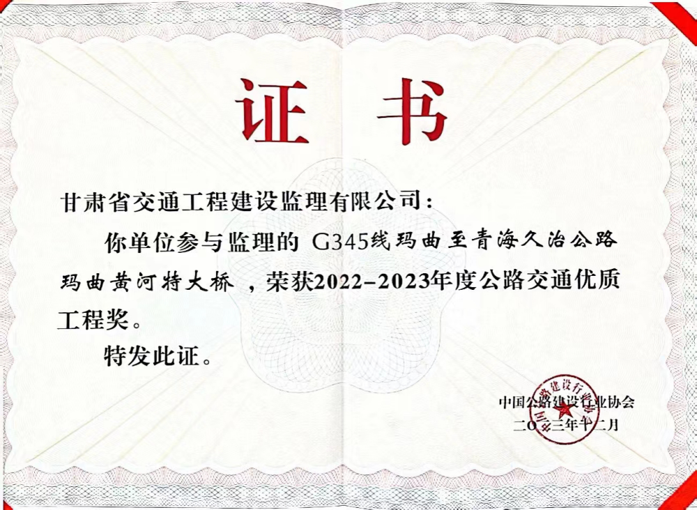 近日,中國公路建設行業(yè)協(xié)會于湖北武漢召開第五屆公路建設高質(zhì)量大會暨2022-2023年度公路交通優(yōu)質(zhì)工程獎表彰大會。省交通監(jiān)理公司“代建+監(jiān)理”的G345線瑪曲至青海久治公路瑪曲黃河特大橋榮獲公路交通優(yōu)質(zhì)工程獎。此次獲獎系公司在兩徽、金阿高速公路之后第三次獲得全國公路交通優(yōu)質(zhì)工程獎——李春獎。