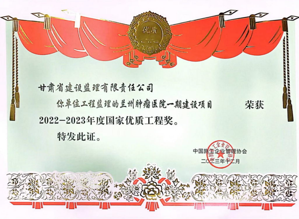 近日,經(jīng)中國(guó)施工企業(yè)管理協(xié)會(huì)評(píng)審,省建設(shè)監(jiān)理公司監(jiān)理的蘭州腫瘤醫(yī)院一期建設(shè)項(xiàng)目榮獲2022-2023年度國(guó)家優(yōu)質(zhì)工程獎(jiǎng)。此前,該項(xiàng)目已先后榮獲甘肅省建設(shè)工程文明工地、2021-2022年度甘肅省建設(shè)工程飛天獎(jiǎng)、2022-2023年度國(guó)家優(yōu)質(zhì)工程獎(jiǎng)。