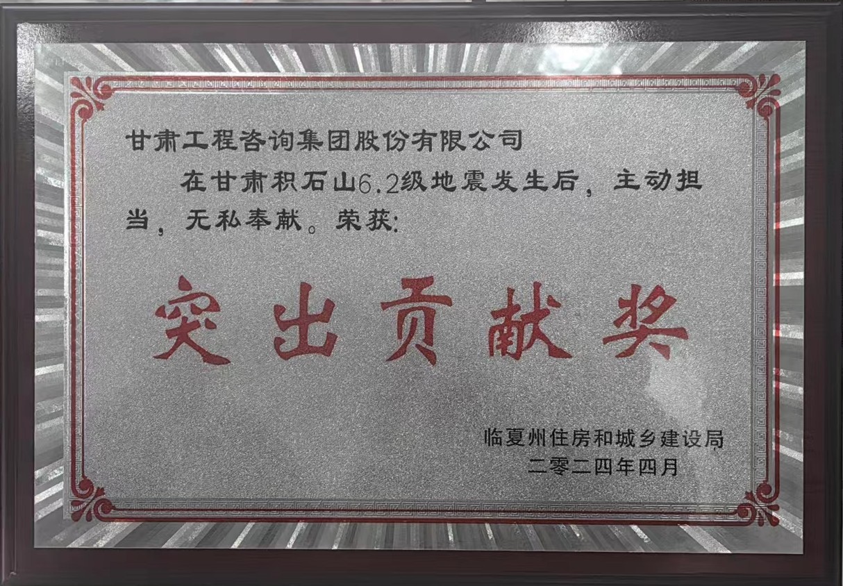 在甘肅積石山6.2級地震后,甘肅工程咨詢集團主動擔當,無私奉獻,在應(yīng)急救援、災(zāi)后重建工作中表現(xiàn)突出,被臨夏州住房和城鄉(xiāng)建設(shè)局授予“突出貢獻獎”。
