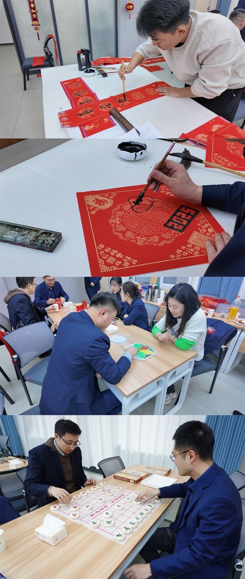 棋牌類游戲區(qū),博弈雙方凝神屏氣、見招拆招、運籌帷幄、樂在“棋”中。春聯(lián)福字區(qū),長桌排開、翰墨飄香,喜迎新春的氣氛撲面而來。一聲聲叫好、一副副春聯(lián)、一個個“?!弊郑休d著大家對新年的美好期盼與祝福。