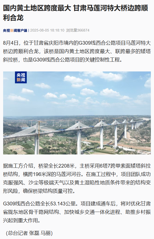 近日,由甘肅工程咨詢集團(tuán)旗下省交通監(jiān)理公司承監(jiān)的G309線西合公路項(xiàng)目建設(shè)取得重大進(jìn)展——馬蓮河特大橋邊跨順利合龍。項(xiàng)目建成后,將進(jìn)一步完善區(qū)域路網(wǎng)結(jié)構(gòu),對(duì)促進(jìn)慶陽(yáng)地區(qū)經(jīng)濟(jì)社會(huì)發(fā)展具有重要意義。