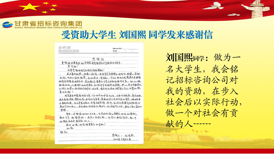 近日,張家川縣張棉驛鄉(xiāng)張棉村貧困大學(xué)生代表劉國熙、周長斌、李雪峰等向甘肅省招標(biāo)咨詢集團(tuán)有限責(zé)任公司發(fā)來感謝信,就招標(biāo)咨詢集團(tuán)給予學(xué)費(fèi)資助一事表達(dá)他們的感激之情。