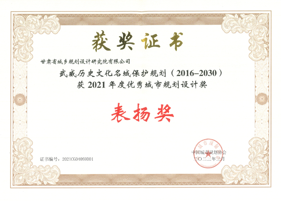 近期,由省規(guī)劃設(shè)計院編制的《武威歷史文化名城保護規(guī)劃(2016-2030)》項目榮獲全國“2021年度優(yōu)秀城市規(guī)劃設(shè)計獎”表揚獎,為我省歷史文化名城保護專業(yè)類唯一獲獎項目。