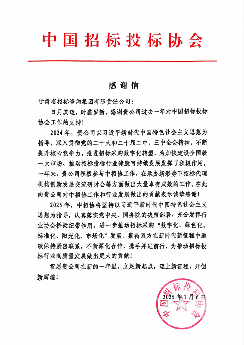 中招協(xié)向省招標(biāo)集團(tuán)發(fā)來(lái)感謝信