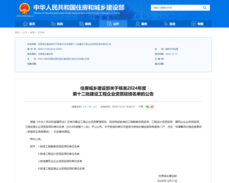 近日,住房城鄉(xiāng)建設(shè)部正式發(fā)布了《關(guān)于核準(zhǔn)2024年度第十二批建設(shè)工程企業(yè)資質(zhì)延續(xù)名單的公告》。省建筑設(shè)計(jì)院建筑行業(yè)甲級(jí)、風(fēng)景園林工程設(shè)計(jì)專(zhuān)項(xiàng)甲級(jí)、市政行業(yè)(給水工程)專(zhuān)業(yè)甲級(jí)、市政行業(yè)(熱力工程)專(zhuān)業(yè)甲級(jí)資質(zhì)通過(guò)核準(zhǔn)延續(xù)。