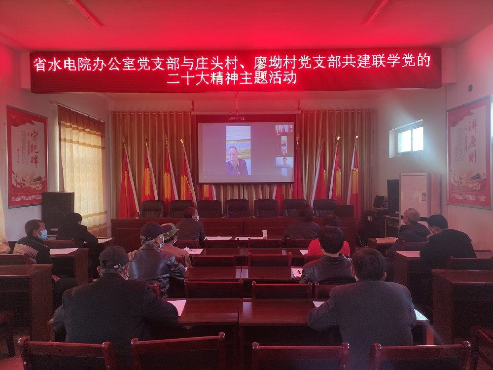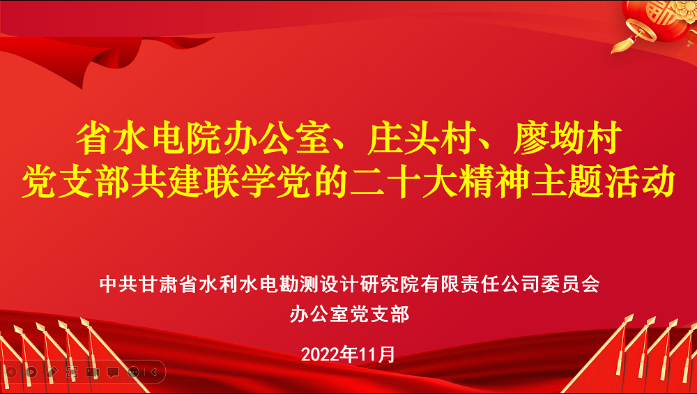 為持續(xù)促進(jìn)黨的二十大精神學(xué)習(xí)貫徹走深走實(shí),使黨的二十大精神進(jìn)村入戶(hù)、深入人心,11月22日,甘肅省水利水電勘測(cè)設(shè)計(jì)研究院有限責(zé)任公司辦公室黨支部與幫扶村西峰區(qū)莊頭村黨支部、廖坳村黨支部開(kāi)展共建聯(lián)學(xué)黨的二十大精神主題活動(dòng)。